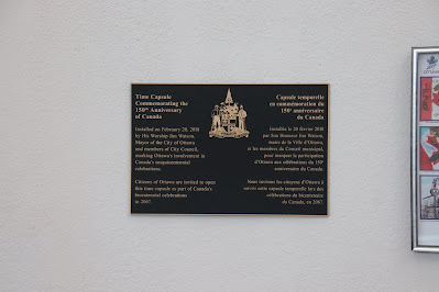 The City of Ottawa's 150th Anniversary of Canada Time Capsule occupies a place on the wall in the main hallway of Ottawa City Hall on the south side of Laurier Avenue West and west of the Rideau Canal.