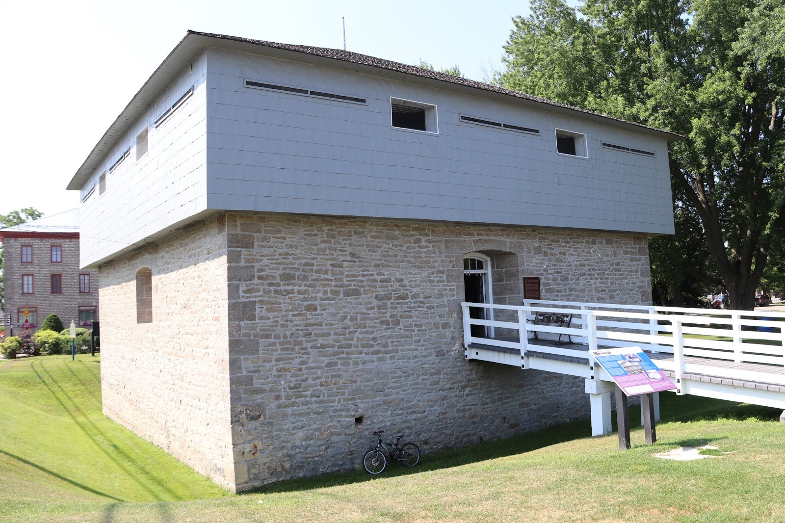 When construction of the Rideau Canal began, Merrickville was already an established village and was considered by the authorities to be a logical target for an invader. Consequently Colonel John By urged strong measures for the protection of the lock station. The result was this blockhouse, built in 1832-33, the largest on the Rideau Canal and the second largest surviving in Canada. It still resembles its early description as "a good blockhouse, the basement and ground floor being of stone, and the upper storey of wood covered with tin, the whole surrounded by a ditch".
